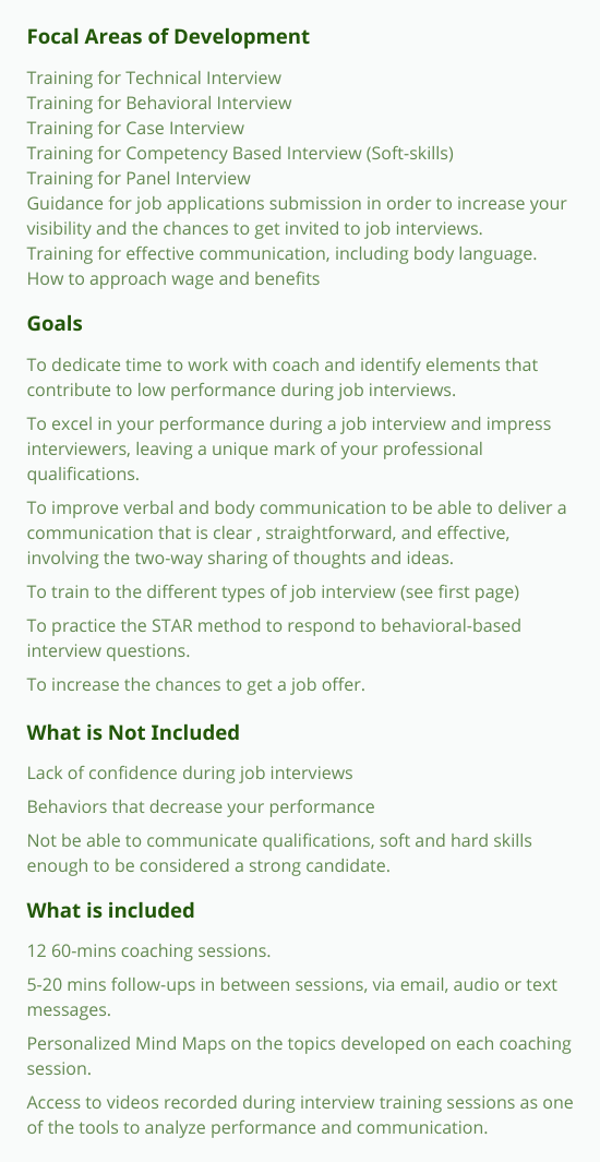 This is a training program targeting to prepare candidates to excel in their job interviews. During the process, we will identify strengths and current challenges to be accepted by potential employers. These are important areas of focus for the preparation for job interviews and all other associated activities. It is important to be aware that job interviews start before that in-person meeting, phone or video call.